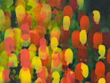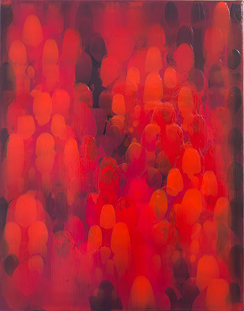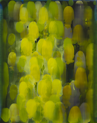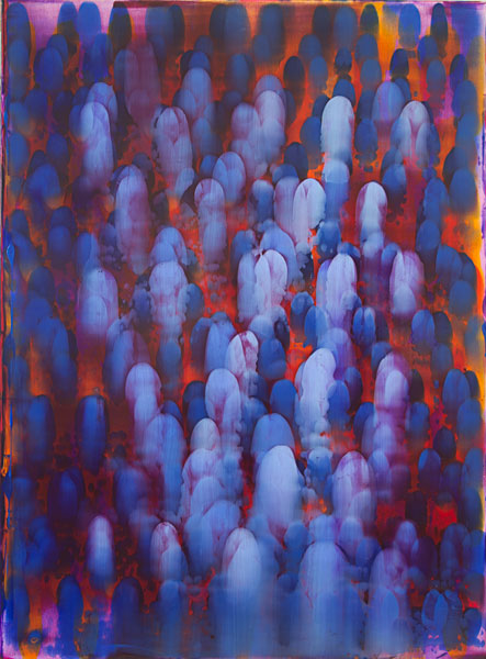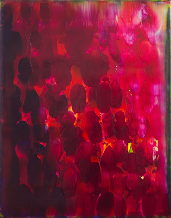 Based on the existing situation on the canvas, I make a move when I choose a new colour and apply spoonsful of paint and spread it with a squeegee.