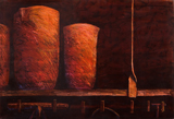 The dried plaster mould was fired overnight in the kiln to remove the wax and the kiln needed to be tended all night of a firing to ensure the heat was increased steadily so the plaster would not blow up. I spent many nights there learning the process. It was on these occasions that I sketched the crucibles stacked on a high shelf on one wall, illuminated in relief by the firey glow from the kiln. |